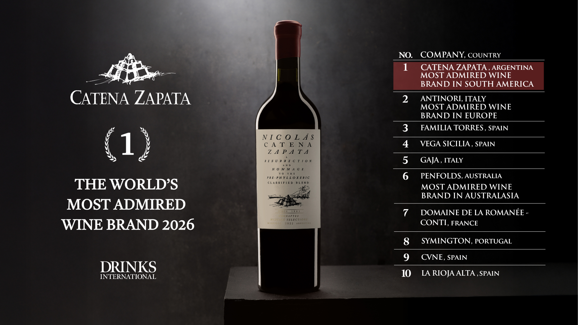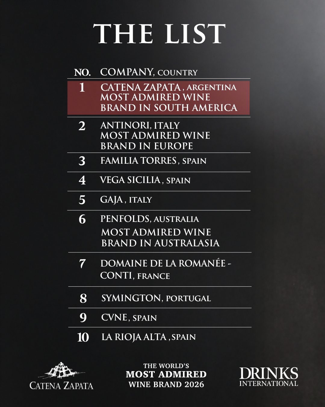 Catena Zapata has once again been recognized as the #1 World’s Most Admired Wine Brand (2026) by Drinks International — marking two consecutive years at the top and reinforcing its position as a global benchmark for world-class wines.